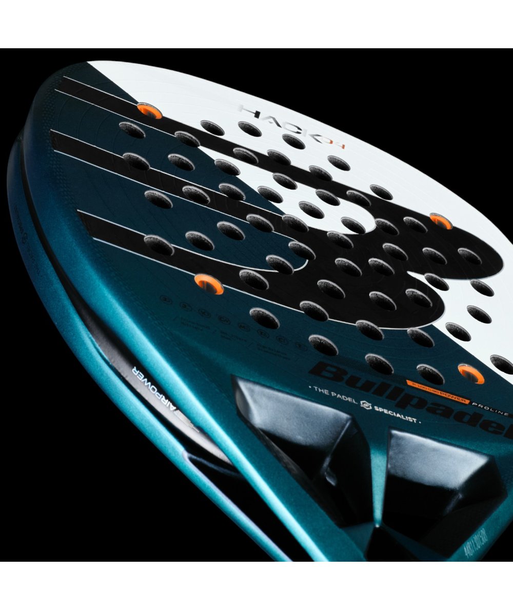 The Bullpadel HACK 04 incorporates a new rough 3D surface with concentric circles, designed to optimize spin. Upon impacting the ball, this new rough surface generates greater friction, ensuring more prolonged and precise contact, which translates into winning effects, both in shots from the back and subtle ones near the net.