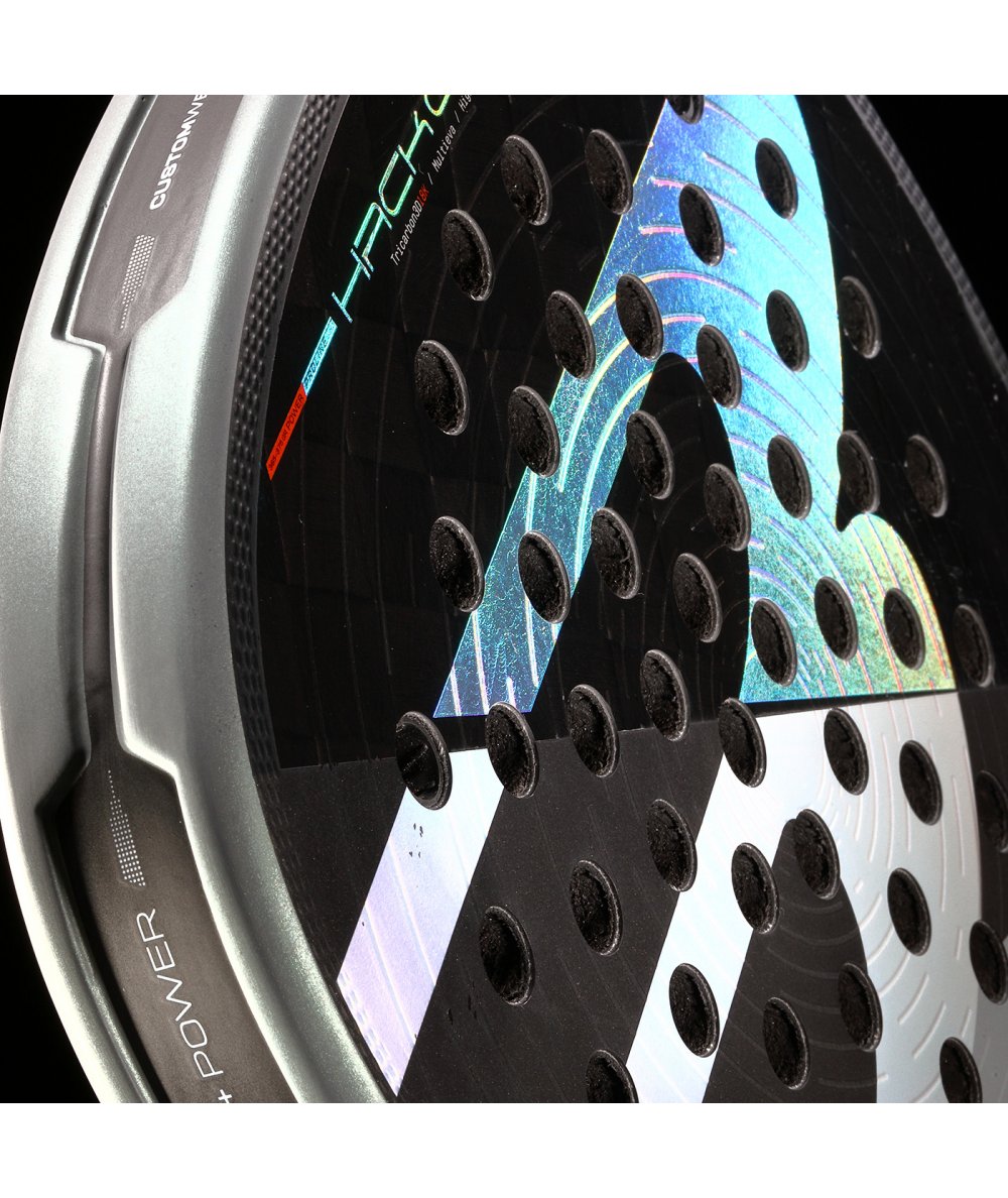 The hole pattern on a padel racket plays an important role in performance, influencing factors such as control, ball output, and power. The new hole pattern in the Hack 04 line has been redesigned with a concentric circle format, allowing for a more balanced distribution, greater flexibility across the racket face, and thus greater ball output and a larger sweet spot.
