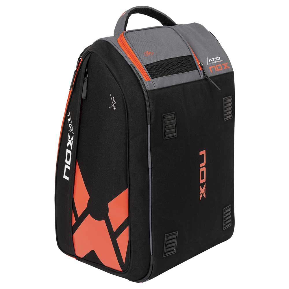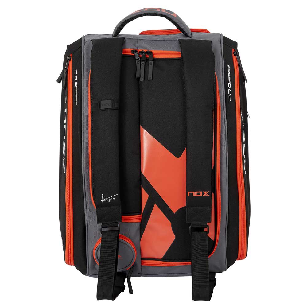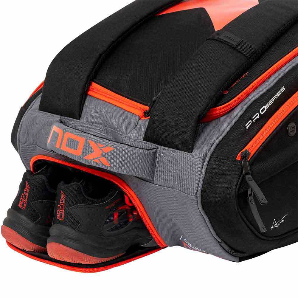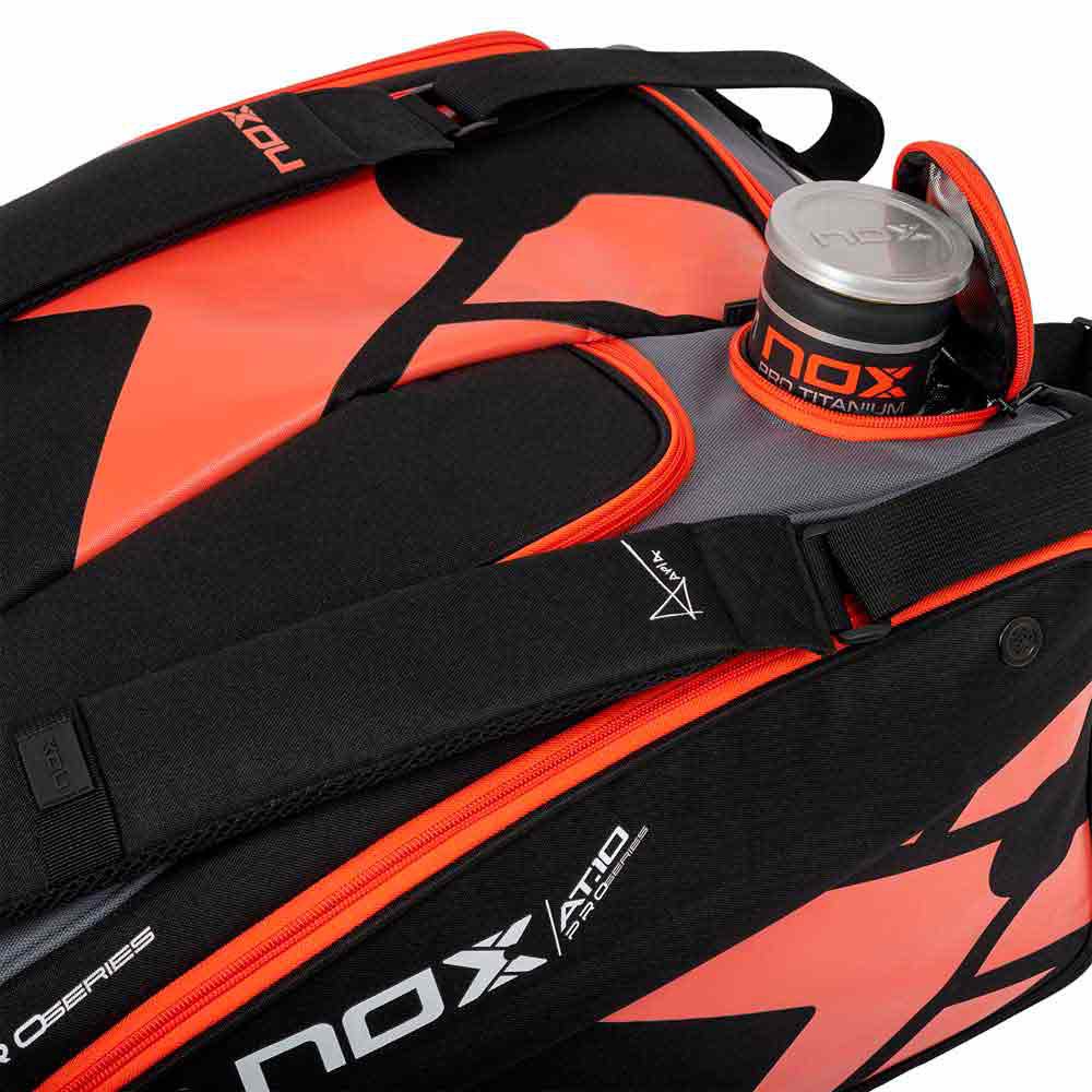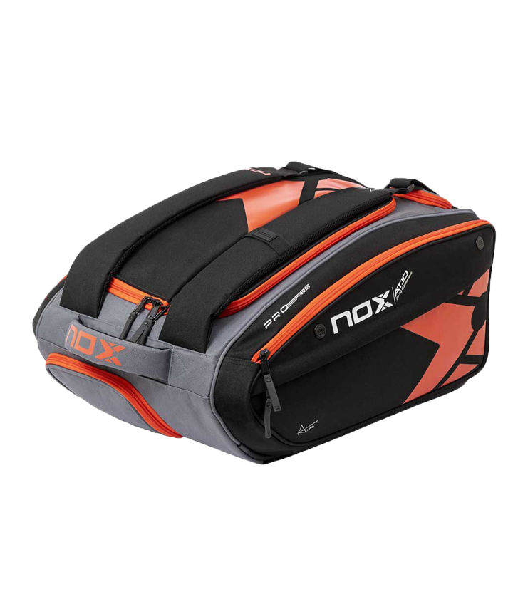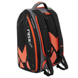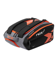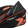 This XXL Agustin Tapia AT10 Nox XXL competition bag is black with orange accents. This bag has several compartments. One to store your balls, one for accessories/shoes, one for your shoes, thermal compartments and an integrated bag for dirty clothes. The NOX AT10 bag is equipped with a handle as well as a handle for easy transport.