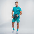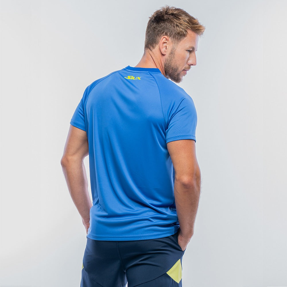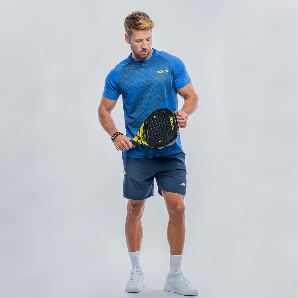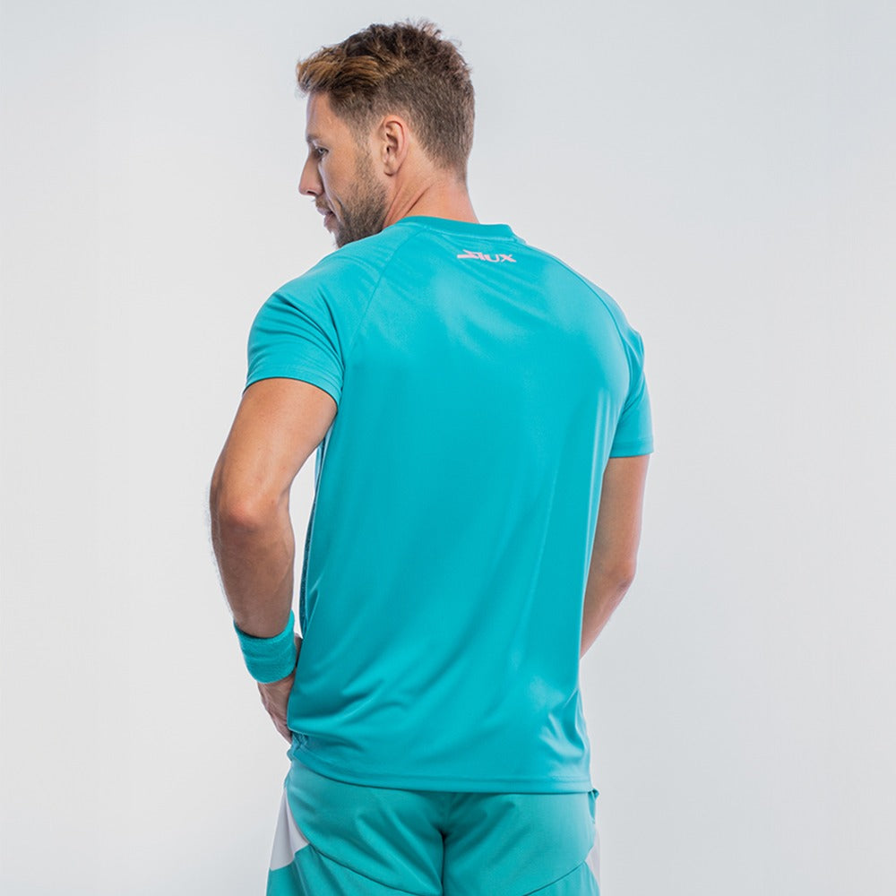 Short-sleeved raglan T-shirt with a round neckline, with an innovative design, made of plain fabric and sublimated micro-perforated fabric on the front.
