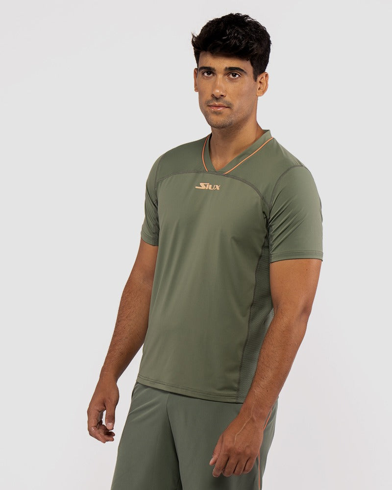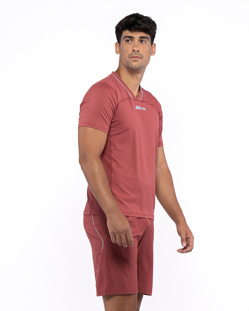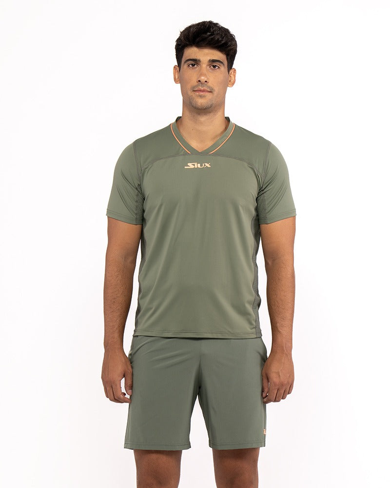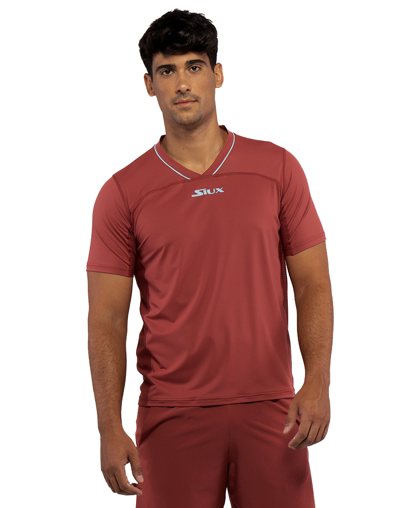 Short-sleeved V-neck T-shirt, with an innovative design, made of plain fabric and micro-perforated fabric on the sides. It features details such as a contrasting color trim on the collar, SIUX logos with rubberized 3D transfer and flatlock seams for greater comfort.