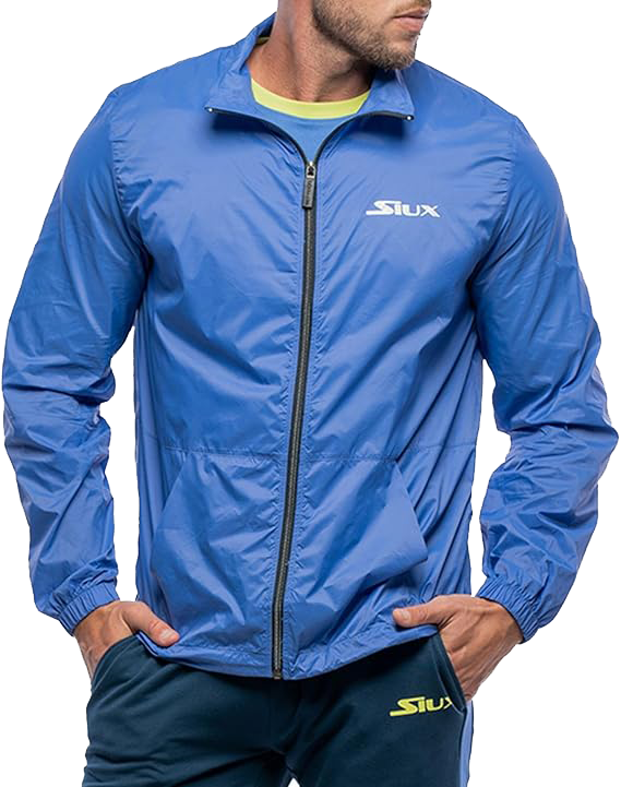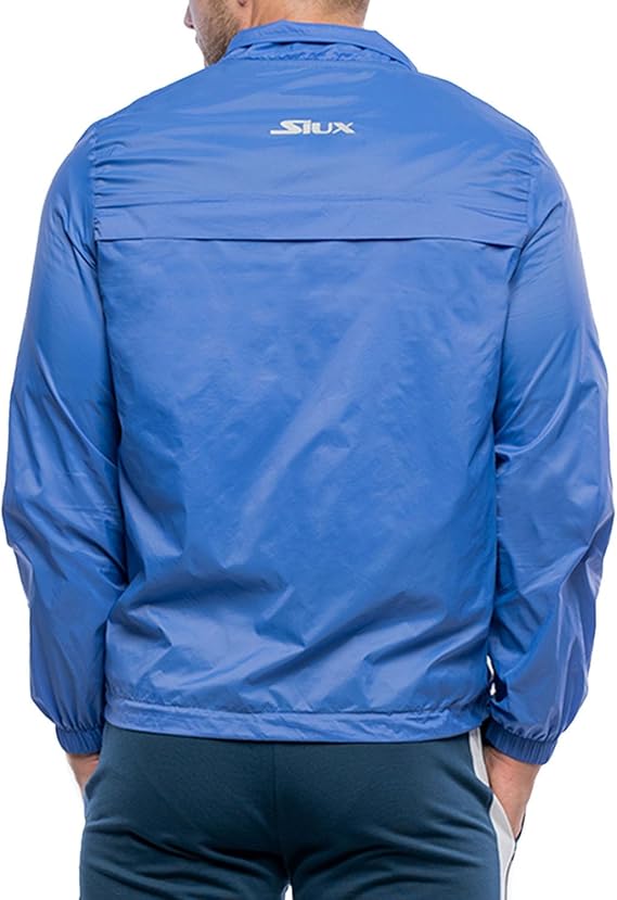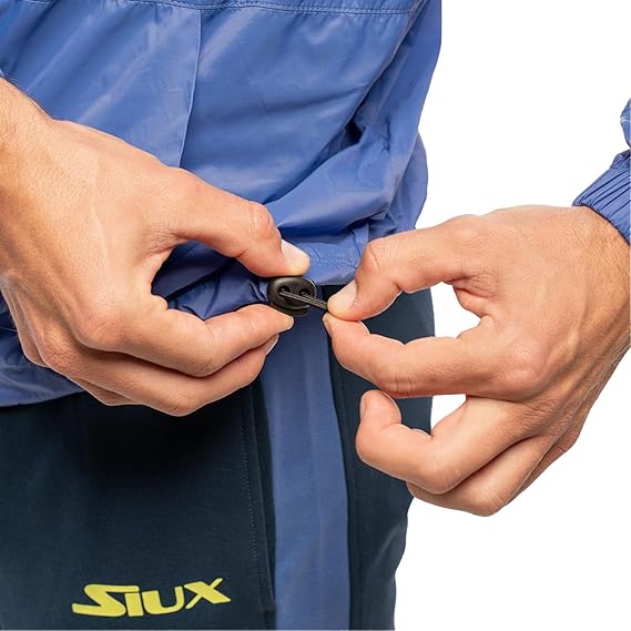 Windbreaker with pockets and adjustable elastic waist, it is made of ultra-light and waterproof polyester fabric, the interior is made of micro-perforated fabric. It features details such as adjustable pieces at the waist, SIUX logo in reflective transfer material and a personalised zip puller.
