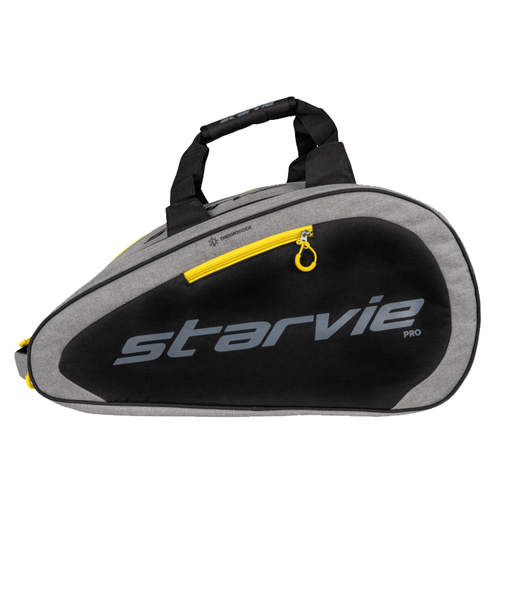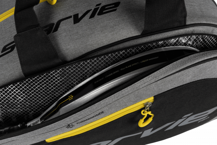 In gray with yellow details, it stands out for its dual Thermotech compartment, keeping your rackets in optimal condition. It also features a ventilated shoe compartment and a side pocket for small accessories, ideal for players who value organization. With a comfortable and durable carrying system, it’s perfect for any player.