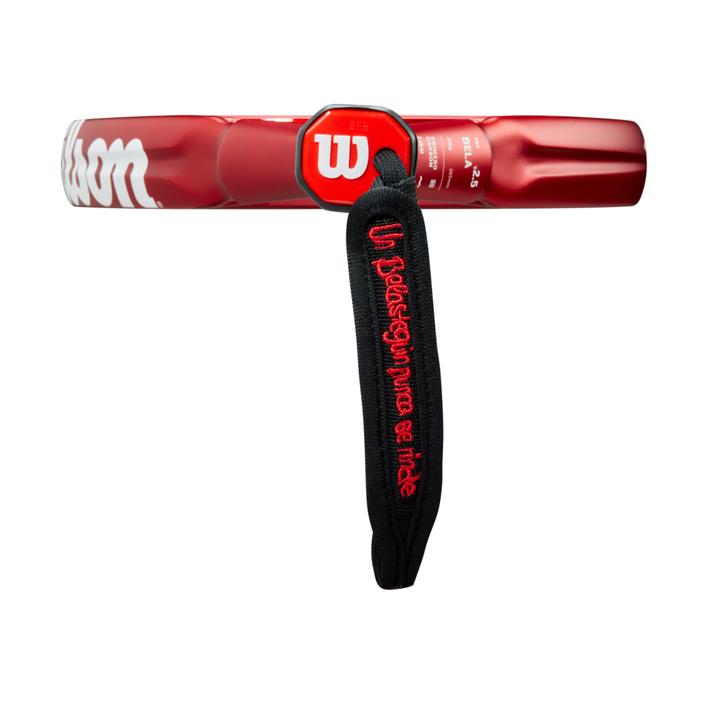 The strap on this pala wraps around and tightens at the wrist to prevent loss of control. Bela personalized the strap with the words "A Belasteguin never gives up" in his daughter's Spanish script.